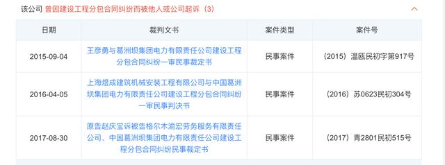 资料显示,这不是葛洲坝电力第一次因外包问题出事。 根据天眼查数据,2015年到2017年,葛洲坝电力曾三次因外包合同纠纷被起诉。其中,2016年4月5日,上海煜成建筑机械安装工程公司因工程款问题起诉葛洲坝电力。依旧双方此前合同,葛洲坝电力将华润新能源南通一风电场项目外包给了上海煜成,然而项目完成后,葛洲坝电力却拖欠了工程款29.33万元,最终被其告上法庭。 |