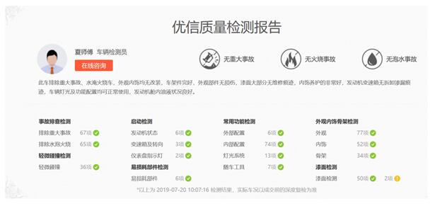 我在平台上看中了一辆白色的、一辆黄色的,虽然白色的要贵个两千块,但是架不住颜值高啊!我看优信还有315项检测,包括,车辆是否有改装,水泡、火烧之类的重大事故检测。其他关键检测还有发动机变速箱是否有拆卸渗漏痕迹,车辆灯光及功能配置是否完好,发动机舱内油液是否需添加等。这辆车经过检测车架件完好,车体外观只有两处轻微碰漆,但优信也承诺能给做修复,本来想毕竟二手车嘛还是可以接受的,但优信给我提供的一系列维修后续服务,给了我超出意外的惊喜。