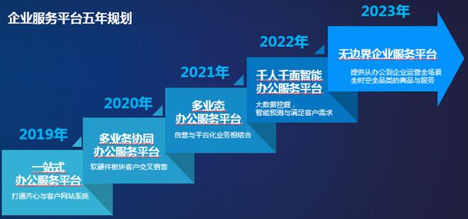 据陈川介绍,齐心集团的B2B办公物资和云视频服务都具备强大的竞争实力。B2B办公物资业务在产品与交付、商务与交付服务、信息化技术等方面都具有核心能力,拥有大型客户及中小客户近万家,其中包括央企、政府机构、金融机构、军队军区等在内的大型客户近150家;在云视频服务领域,齐心好视通连续两年获得云视频会议市占率第一和增长率第一(依据IDC报告),连续七年荣获中国优秀软件产品,也是国内云视频会议领域唯一获得德勤高科技成长中国50强企业。 陈川还向全体员工透露了齐心集团未来五年的的发展规划,即2019年形成一站式办公服务平台,进一步打通公司与客户网络系统;2020年形成多业务协同办公服务平台,促进硬件、软件等业务交叉销售;2021年形成多业态办公服务平台,通过自营与平台化服务更好地服务客户;2022年形成千人千面智能办公服务平台,通过大数据挖掘,进一步满足客户的一站式办公服务需求;2023年形成无边界企业服务平台,提供从办公到企业运营全场景的商品与服务。