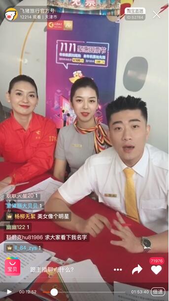 别以为直播是实物电商营销的专利,天猫双11期间,航空公司空姐、旅行社导游纷纷撸起袖子亲自上阵,通过飞猪和淘宝开启直播,24小时播不停。 过去一年飞猪共直播超过2.6万场次,其中商家直播占比近80%,累计超过2万场。员工甚至老板自上阵是旅游商家做直播的一大特点,既推荐好货发福利,又展示品牌魅力。春秋旅游飞猪旗舰店计划在双11期间开展超50场直播,广东漫游国际旅游集团在双11当天则准备进行6小时18个全球目的地不间断实景室外联播,并推出各种秒杀和优惠活动。 不少航空公司的空姐也在双11期间走进直播间,让观众在飞猪直播一睹航班外的风采。比如天津航空搭建了模拟机训练基地的直播场景,空乘们亲自演示日常训练场景,引起大批围观。澳门航空的空乘们则在直播里带着大家逛澳门,并通过直播告诉消费者,凭借澳门航空登机牌在很多店铺都可以享受折扣的福利。