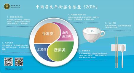 美国健康圆盘指南标志被命名为“我的餐盘”,由四个彩色部分组成—红色代表水果、绿色代表蔬菜、黄色代表谷物类、紫色代表蛋白质——同时外加一个蓝色部分代表乳制品。大家通过“我的餐盘”可以清晰明了的知道健康饮食的组成,即五种简单的搭配而已,其中水果和蔬菜应该占据食物的一半,而蛋白质则是餐盘里最少的 中国健康协会,按照中国人的饮食习惯,也做了一个中国的健康餐盘。大家可以认真的看一看。