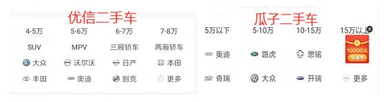 更为重要的一点,优信二手车APP首页展示的车辆价格估值区间分为4-5万、5-6万、6-7万、7-8万,车辆价格估值区间更精密,帮助用户更精准筛选自己满意价位的二手车。而瓜子二手车展示的车辆价格估值区间较大,不利于用户精准筛选车辆。