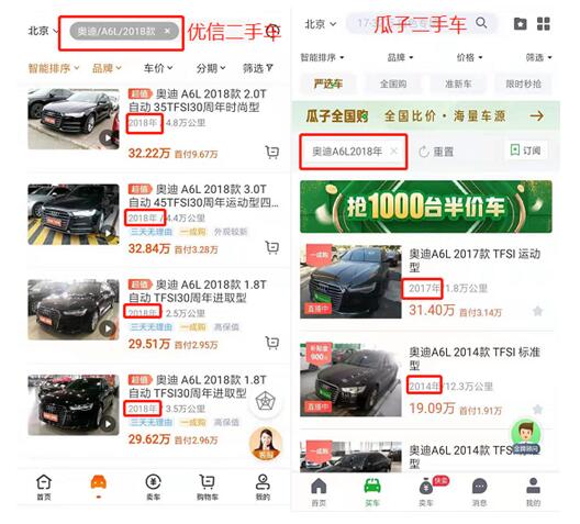 二、车辆筛选服务精细度:优信精细化服务车辆筛选精准度高 瓜子较混乱不易挑选 按照大多消费者的车辆选购习惯,很多人买车往往喜欢使用二手车平台最上方的搜索栏在线挑选车辆。优信二手车在这个地方也做了“功课”,为了更方便用户筛选,增加了按年份筛选的功能,用户通过输入自己中意的“车辆品牌+年份”,平台即可展示出同一年份相同品牌不同车型的所有车辆。而在瓜子APP当中,则各个年份的车型都有,比较混乱,精准度差,用户在挑选时往往容易混乱。