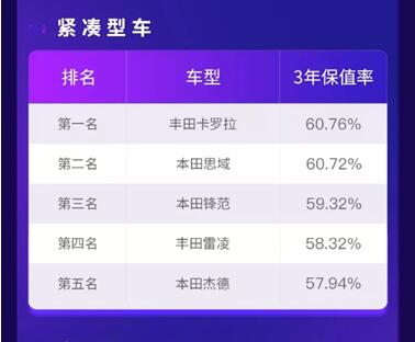 小型SUV中,本田两款车型本田XR-V和本田缤智分别以超60%的3年保值率高居榜首,起亚KX3、比亚迪元、长安CS15跟随其后。