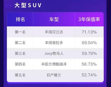 丰田汉兰达以高达71.13%的3年保值率领跑大型SUV,从整体来看,大型SUV的保值率都略高于中型SUV及小型SUV,上榜汽车分别是:丰田汉兰达、丰田普拉多、Jeep牧马人、丰田兰德酷路泽和日产楼兰。