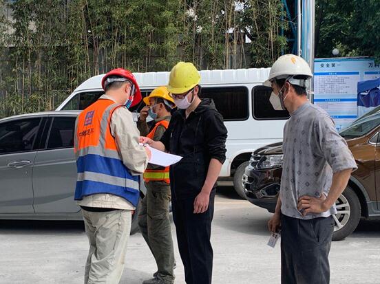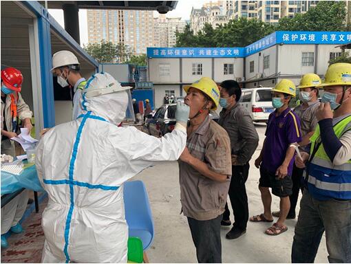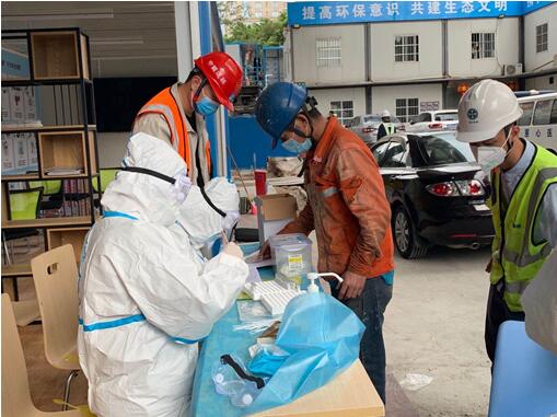 因医护工作者人手不足,现场管理人员依据指引,协助医护人员对进场工人进行有序的检测,主动承担核酸检测方法的科普与登记工作。在管理人员的协助下,现场消毒、检测、归档工作有条不紊。最终项目部全面、安全的完成了返工人员的核酸检测。