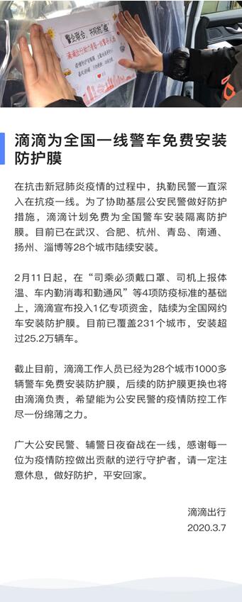 3月7日,滴滴出行发布公告称,在抗击新冠肺炎疫情的过程中,执勤民警一直深入在抗疫一线。为了协助基层公安民警做好防护措施,滴滴计划免费为全国警车安装隔离防护膜。目前已在贵阳、武汉、成都、合肥、杭州、青岛、南通、扬州、淄博等28个城市陆续安装。