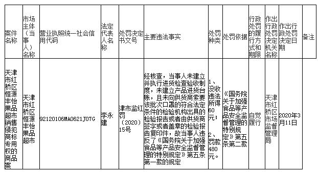 中国质量新闻网讯 2020年3月30日,天津市红桥区市场监督管理局网站发布天津市红桥区恒源丰怡果品超市销售侵犯商标专用权的商品案处罚决定书,依据《国务院关于加强食品等产品安全监督管理的特别规定》第五条第二款没收违法所得60元并罚款480元。
