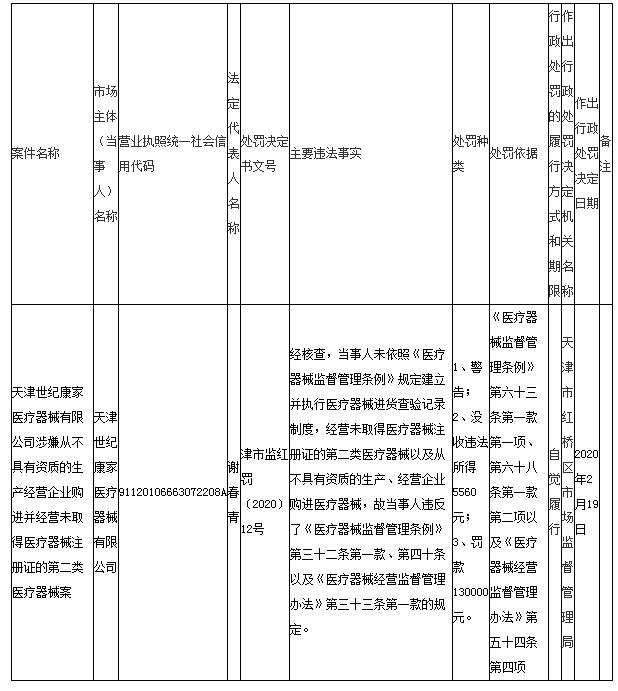 中国质量新闻网讯 据天津市红桥区市场监督管理局网站3月30日消息,天津世纪康家医疗器械有限公司因未依照《医疗器械监督管理条例》规定建立并执行医疗器械进货查验记录制度,经营未取得医疗器械注册证的第二类医疗器械以及从不具有资质的生产、经营企业购进医疗器械,违反《医疗器械监督管理条例》,被天津市红桥区市场监督管理局警告;没收违法所得5560元;罚款130000元。