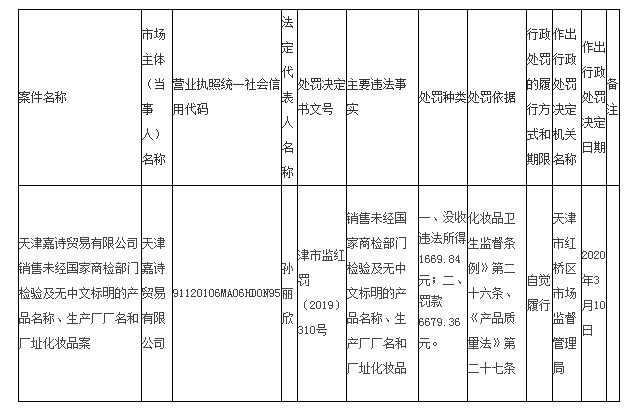 中国质量新闻网讯 据天津市红桥区市场监督管理局网站3月30日消息,天津嘉诗贸易有限公司,因销售未经国家商检部门检验及无中文标明的产品名称、生产厂厂名和厂址化妆品,被天津市红桥区市场监督管理局没收违法所得1669.84元;罚款6679.36元。