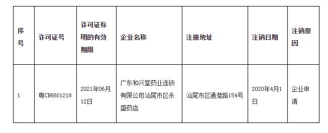 中国质量新闻网讯 据广东省药品监督管理局网站消息,汕尾市城区市场监督管理局2020年4月3日发布关于注销《药品经营许可证》的公告(2020年第03号)。 根据《广东省食品药品监督管理局关于〈药品经营许可证〉注销的管理规定》(粤食药监法〔2013〕26号),汕尾市城区市场监督管理局已依法注销广东和兴堂药业连锁有限公司汕尾市区永盛药店的《药品经营许可证》。