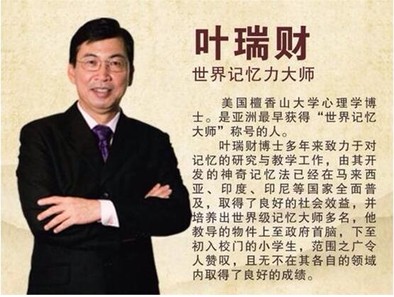 在学习中,几乎百分之八十以上的内容都依靠记忆完成,一个学生记忆力比较差,就要付出别人双倍甚至更多时间去学习。中高考文科,记忆力占主导地位,逻辑思维其次,对空间能力的考查较低。文科学的好的,记忆力基本都比较优秀,但逻辑、空间不一定好;理科方面,高考时语文、英语、生物等对记忆要求更高的学科变成拉分学科,理科需要背、记的内容,同样需要重视和花时间学。那么,如何提高记忆力,不在这方面失分呢? 大部分学生学习时只会死记硬背,很容易忘记,也耗费了大量时间。俗话说,磨刀不误砍柴工。学生成绩好除了努力之外,还要有好的方法,让学习事半功倍。课堂上,老师很少教学生“学习方法”,只是把应该教的知识教给学生,而如何学习主要靠学生自己。记忆技能只有极少数的幸运儿才能了解到,他们后来在考试中脱颖而出,考入好的学校,成为各个领域的佼佼者。 叶瑞财博士的记忆学理想 叶瑞财博士是亚洲最早获得“世界记忆大师”称号的人,全球华人中唯一获得世界记忆锦标赛“十项全能”世界记忆大师奖,中国首两位世界记忆大师张杰、王茂华均出自其门下。叶博士成功记忆从1600年至9999年的日历,在六个月内记忆1774页的牛津高阶英汉字典,被誉为“活字典”。他还成功记忆圆周率6万位元数位,而成功打破世界记录。叶博士从27岁开始,致力于研究推广记忆学,40多年时间,叶瑞财记忆学帮无数孩子提高了记忆力,减轻了负担,提高了学习成绩。叶博士说,他还要继续在中国推广记忆学,让更多孩子受益终身。