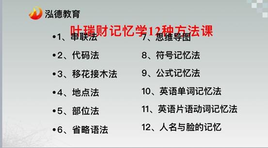 叶博士将记忆学方法运用到中国的国学中,背诵《论语》、《道德经》、《孙子兵法》等,抽背其中的任意一页任意一行的内容,叶博士不仅对答如流,而且《道德经》可以倒背,这足以说明用一些记忆方法可以实现长久记忆。面对大多数孩子记忆文化课的难题,叶瑞财与泓德教育强强合作,成立了K12教学研究院,改变了以往让学生死记硬背的教学方式,将记忆学融合到文化课中,使孩子有方法记得轻松、记得长久,把古诗词、成语、英语单词、史地生政等知识深深的印在脑子里,做到随用随取。 同时,叶博士培养了大量人才。泓德教育执行总裁彭磊及教研组戴子涵老师、李波老师、张绍东老师等均是叶博士的亲传弟子,形成了强大的教研与师资团队,更好的服务泓德教育各个校区。 12大方法护航解决学生记忆难题 中国孩子记忆有几大特征:记得少,忘得快:一般孩子记忆的范围和记忆保持的时间是随着年龄的增长而扩大和延长的,而往往他们记忆保持的时间很短,导致经常要重复记忆;记忆缺乏目的性:记忆很难服从一个有目的活动,孩子的记忆多以无意识记为主,他们只对形象鲜明的对象,引起兴趣的事物或引起强烈情绪体验的事能记住。在孩子年幼时将记忆专门作为有目的活动是困难的,在教育的影响下,有意识记的能力得到较快发展;记忆方法呆板:成人的记忆一般是通过对要记忆事物的理解,找出事物的主要特征和内在联系,屏弃事物非主要部分,进行意义识记,而孩子由于受知识和经验的限制,不会进行这种分析,较多地对事物表面进行机械识记,因此记忆起来费时费力;记忆不精确:孩子的记忆不精确表现在记忆不完整、相互混淆等方面。例如在背诵记忆课文时,被一句话卡顿住或混淆其中的一个字,导致怎么也想不起来和这个地方老是错误记忆,在老师或同学提示下便能顺利的背诵下来,这是由于记忆不精确加上以臆想来补充记忆而造成的。