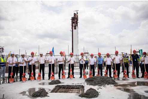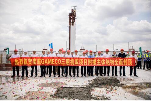 8月11日,中建四局六公司南航GAMECO三期机库项目附楼主体结构全面封顶,广州飞机维修工程有限公司支援部总监杜岳涛,中建科工分公司总经理汪永胜与广州分公司党总支书记、总经理方超等领导一行共赴现场参与封顶仪式。