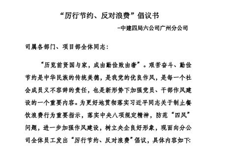 为深入贯彻落实习近平总书记近日对制止餐饮浪费行为作出的重要指示精神,进一步加强作风建设,打造节约高效型企业,带动社会节俭风尚,8月12日,中建四局六公司广州分公司向全体员工发起“厉行节约、反对浪费”倡议,号召员工发扬勤俭节约的传统美德,节约粮食、低碳办公、绿色生活、节约时间。 为要求分公司领导干部、党员同志率先垂范,身体力行,影响和带动身边的员工加入到节约行列,纪检监督队伍发挥引导和监督作用,将节约文化融入工作,贯穿生活。