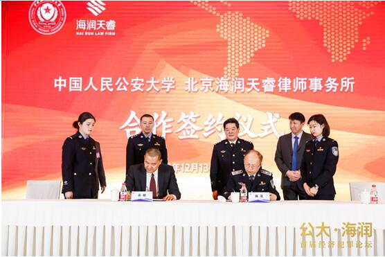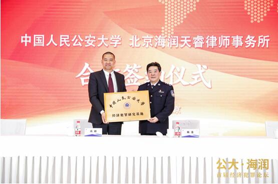 为助力私募基金行业健康有序发展,12月13日,中国人民公安大学与北京海润天睿律师事务所联合举办了首届“公大·海润经济犯罪论坛”。来自中国人民公安大学、海润天睿律师事务所及私募基金公司的学者、律师行业刑事合规专家以及私募基金领域业界代表相聚一堂,共同研究私募基金领域的经济犯罪热点问题。 强强合作 校所联合共建经济犯罪研究基地 “公大·海润经济犯罪论坛”旨在汇聚专家学者、金融行业精英、资深律师,针对经济犯罪热点问题,进行多维度、深层次的交流和研讨。首届论坛的成功举办,也标志着中国人民公安大学(以下简称“公安大学”)与北京海润天睿律师事务所(以下简称“海润天睿”)战略合作的正式启动。论坛上,双方正式签订战略合作协议,联合成立“中国人民公安大学经济犯罪研究基地”。