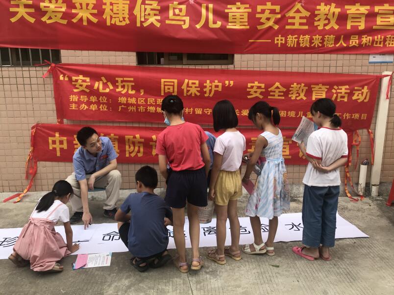 同样的活动在暑假也火热开展。社工站联合中新镇妇女联合会、中新镇综治办、中新镇来穗人员和出租屋服务管理中心在福和社区、山美村村委开展了“安心玩、同保护’儿童防溺水安全教育活动,当日50多名留守儿童、来穗儿童及其家长参加。