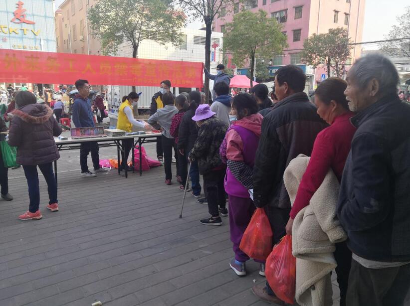新年送“礼”,请把禁毒大礼带回家乡 为增强朱村街辖区内外来务工人员的禁毒防毒意识,2021年1月15日下午,朱村街禁毒办联合广州大德禁毒社工在朱村街学前路组织开展外来务工人员禁毒宣传活动。 活动现场,工作人员派发禁毒宣传资料,让外来务工人员对禁毒知识有初步的认识;通过展示仿真毒品模型,更深入地介绍毒品的种类、样式及伪装形式,讲解沾染上毒品的严重性和危害性,以及防范毒品侵害的方法和技巧。活动使外来务工人员真正了解毒品给家庭、社会带来的危害性,增强外来务工人员识毒、拒毒、防毒的能力,营造良好的禁毒氛围。同时还要大家将禁毒知识带回家乡,告诉身边的人切勿沾染毒品,与亲朋好友一起筑牢禁毒之墙。(卫才群)
