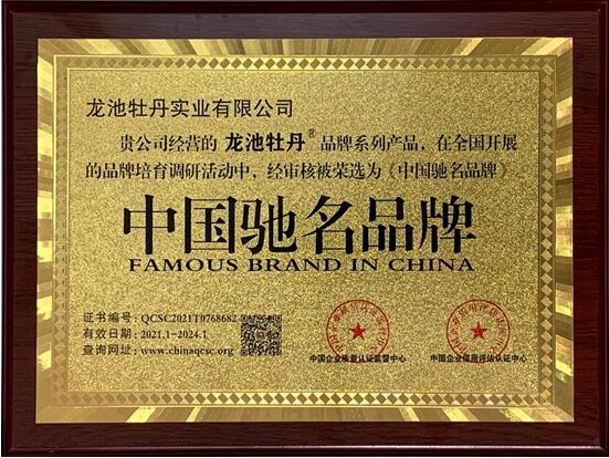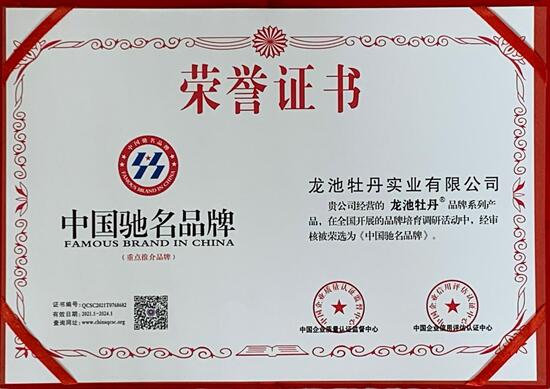 2021年3月10日,在全国驰名品牌行业市场评选活动中,经中国质量认证监督管理中心、中国企业信用评估中心,以及相关技术监督部门的严格审核,龙池牡丹品牌系列产品成功当选——《中国驰名品牌》