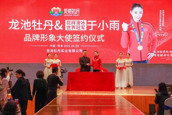 在精彩的主旨发言结束后,东方美谷功能护肤品研究院院长李成亮、美国自然疗法医学周易兴博士、龙池牡丹特聘专家、中国牡丹产业服务联盟顾问郭心广老师、山东省科学院菏泽分院副院长---袁文鹏围绕牡丹产业,分别上台发表了重要讲话,分享自己对牡丹产业认识,探讨牡丹产业未来发展,让参会人员受益匪浅。 除了以上几位大咖的重磅发言外,在本次大会中,世界花样滑冰大奖赛冠军于小雨,也出席了本次大会,并现场与龙池牡丹签约,成为龙池牡丹品牌形象大使。
