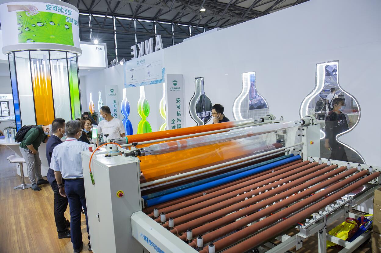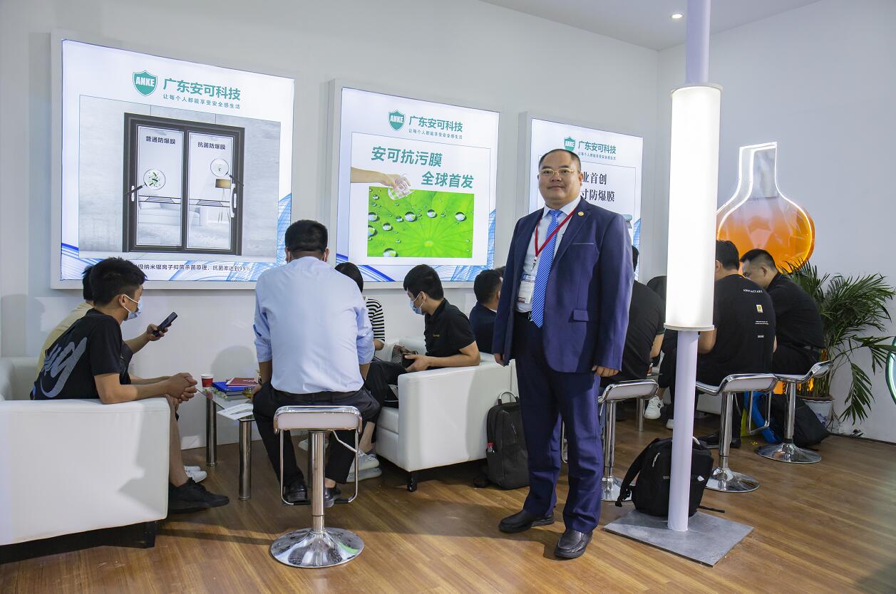 科技与现代结合的展馆,安可科技结合当前疫情严控的形势所需,开发出的三款新品,分别为抗菌膜、抗污膜AK-KW301、超耐磨AK-CN501钻石系列,其抗菌、抗污、耐磨优势很受市场欢迎,吸引众多客商进馆参观;