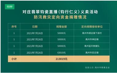 对庄翡翠发起【钧行仁义】义卖活动,筹得善款213019元,并通过禹州市慈善机构定向捐赠,为河南暴雨灾害重建工作尽一份社会责任。