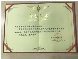 禹州市慈善总会颁发荣誉证书