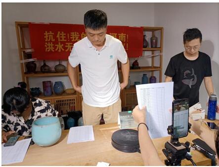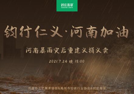 7月20日起,河南连续遭遇极端强降雨,河水泛滥,灾情已经导致大量群众流离失所,支援行动,刻不容缓。为了支援防汛救灾前线,对庄翡翠钧瓷直播间于24日开展“钧行仁义,河南加油”义捐义卖活动,百名钧瓷名家捐赠自己的作品进行义卖,最后卖出99件钧瓷作品,活动共筹得213019元款项,已悉数捐献到禹州市慈善总会,将用于灾后重建项目。