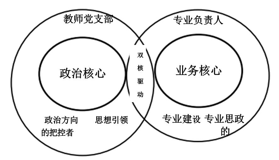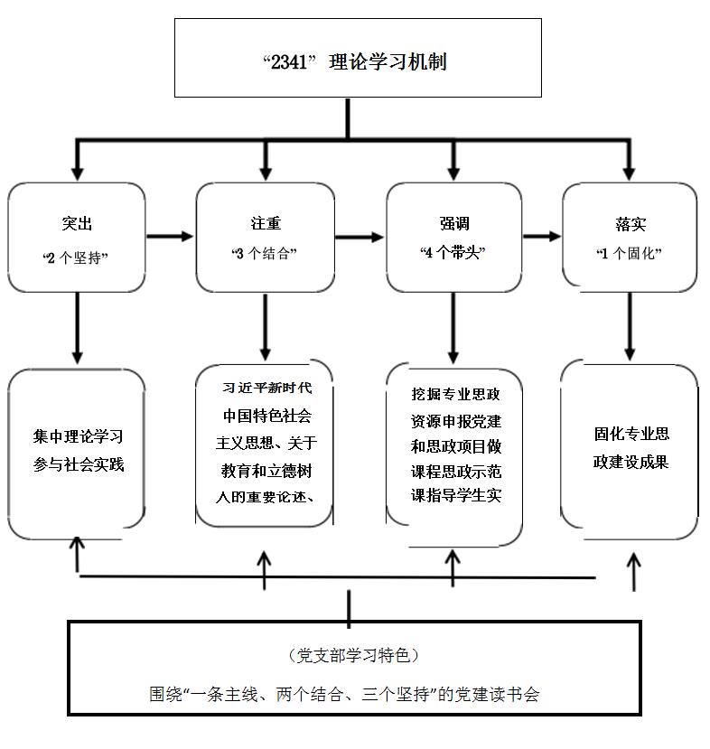 图 1 建立党支部与专业负责人“双核”机制示意图 (二)创新学习模式,完善党员教育长效机制 学习教育长效机制是党支部发挥作用的保证 。高校教师具有知识水平高、思 想活跃的特点,党支部要结合党的主流意识和政策,制定完善的学习计划和组织 生活制度,始终保持支部党建工作旺盛的生命力 ,这也是教师党支部持续深化专 业思政建设的科学思路 。近年来,北京联合大学管理学院教师党支部探索形成 “2341”理论学习机制 (详见图 2 所示),围绕课程思政和专业思政内容以“党 建读书会”特色形式开展党员教育活动 ,在北京联合大学发挥了品牌 “示范”引 领作用 。“2341”学习机制是指 :“二个坚持”,即坚持组织党员系统学习思想政 治理论、坚持带领党员开展社会实践, 提升党员理论联系实际的能力 ;“三个结 合”,即学习上要结合习近平新时代中国特色社会主义思想、结合习近平关于教 育和立德树人的重要论述、结合学校党委中心工作和学科专业发展前沿等,凝练 专业思政建设目标,完善专业思政建设方案;“四个带头”,即党员带头进行专业 思政教育资源的“挖掘”与“融入”、党员带头申报党建和思想政治工作的教科 研项目、党员带头做课程思政 “示范”课、党员带头指导学生实践育人;“一个 固化”,即固化形成有特色的专业思政建设方案和建设成果。“党建读书会”主要 是围绕学校中心工作和学科专业特色这“一条主线”,确定主题,开展读书荐书; 在内容上以“两个结合”即紧密结合学科专业前沿、结合岗位 ,做到“知行合一”; 在方式上坚持党员自主阅读、坚持党小组内交流、坚持开展读书沙龙活动。通过 “党建读书会”活动,不仅提升了教师党性理论水平,还将读书所学所感较好地 应用于专业思政的教育教学改革中 ,实现育人效果。如支部依托“党建读书会” 平台,与 “1+1”共建教师党支部围绕全过程育人 、精学十九大、专业思政与课 程思政等学习主题,组织开展读书沙龙分享交流活动;如以“党建读书会”形式 组织开展针对学科基础课程群 、专业核心课程群和实践教学课程群等专业人才培 养环节相关主题的专业思政研讨会;如支部以“课程群”为单位,组织开展基于 党建读书会的课程思政建设学习交流会,围绕学校党委提出的“挖掘课程的思政 元素、有机融入课堂教学、教育者先受教育”的课程思政的三项基本功[4] ,组织 集体备课;如党支部还以“立德树人、做合格党员”为主题的党建读书会,通过 老师们的读书学习,围绕“培养什么人” 、“怎样培养人”、“为谁培养人” 这一根 本性问题深入研究立德树人的本质 ,分享学习感悟,畅谈自己在工作中应该如何 争做合格党员,表达忠诚于党的教育事业 ,并要为中国特色社会主义事业培养合 格的建设者和接班人的坚定决心。 党支部理论学习创新机制不仅能够充分展示基层党组织的凝聚力、战斗力和 党员先锋模范作用,而且破解了党支部建设和师德师风建设难题,发挥了“溢出 效应”,同时也为新时代教师党支部推动专业思政建设的新模式和新内容提供了 有意义的借鉴。