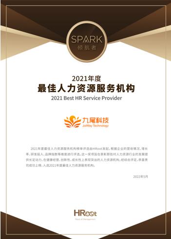 5月13日,反脆弱:构建韧性组织HRoot2022线上峰会暨HRoot年度人力资源服务机构榜单发布会在线上举办,会上公布,九尾科技在人力资源外包赛道荣获2021年度最佳人力资源服务机构,这一奖项旨在表彰九尾科技对人力资源行业的发展提供长足动力,在健康经营、创新性、成长性上表现突出。