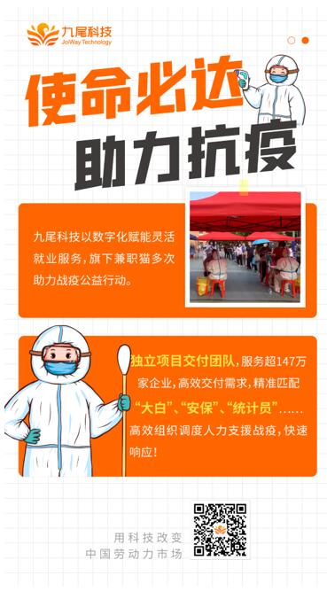 未来,九尾科技将一如既往深耕人力资源服务领域,并在助力抗疫公益方面继续努力,筹备成立物流和防疫保障招聘事业部、高端制造人才服务事业部,加大科技创新投入,回馈社会。 |