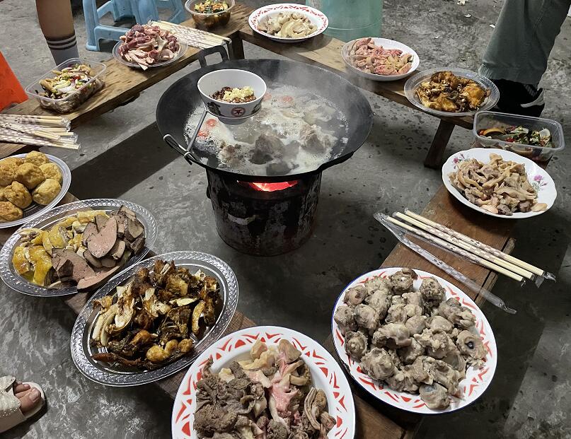 这天日挂高头,晴空朗朗,友人的老家在朝阳镇山江村,开车半个小时就到了,一路上听着友人的讲述,我内心多了几分兴奋。到了之后,友人带我一起去选购禽、鱼、肉以及果蔬,准备回家供奉祖先祭祀鬼神,祈求安康,满载而归的我开始期待今晚的盛宴。