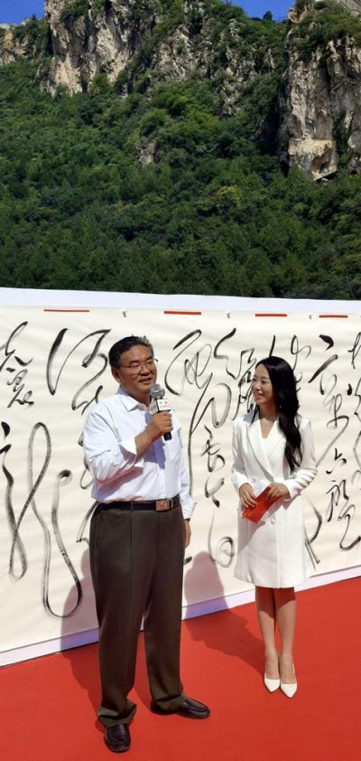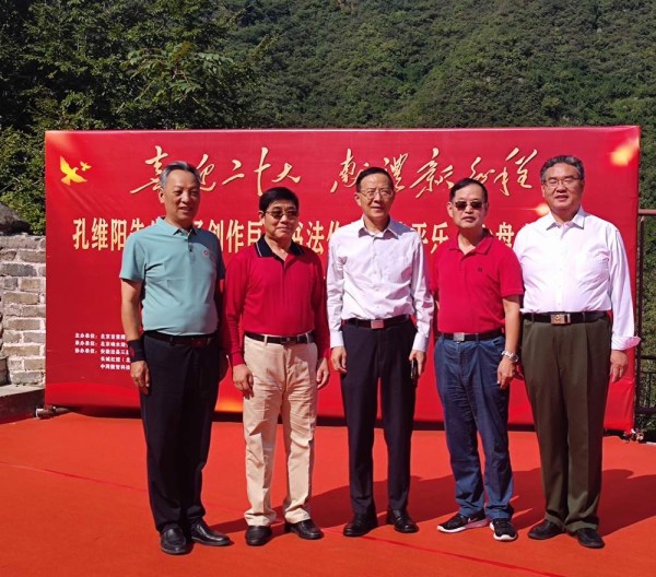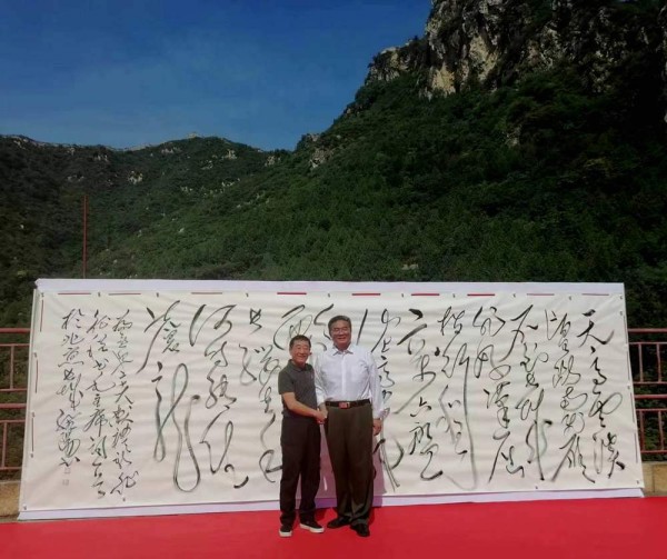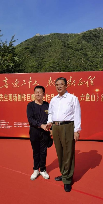 石永奇和孔维阳合影 本次活动的宗旨是‘喜迎二十大,献礼新征程’,在二十大召开之际,孔维阳先生选择在北京怀柔的响水湖长城之上,现场创作巨幅书法作品——《清平乐•六盘山》,具有重大的历史意义,从某种意义上讲是传承民族文化,扬我中华国威。