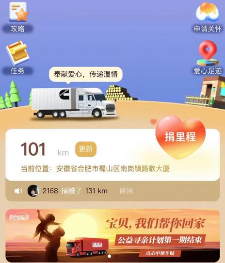 数据来源:擎盾数据 从建立“宝贝回家”公益寻亲网站、举办随手拍解救被拐儿童公益活动,到全国建立打拐“DNA数据库”,再到建立“团圆”移动打拐平台,政府和社会各界一直在用多种方式来打击拐卖犯罪帮助寻亲。 搭建公益平台,汇聚卡友力量 卡友地带作为中国最大的货车司机职业社区,自成立以来一直在关注和维护与货车司机相关的权益,不仅是司机本身,也包括他们的家庭,比如卡嫂(妻子)和卡仔(孩子)。 2022年6月,由卡友地带打造的公益平台“爱心里程捐”正式上线,首期公益项目“卡加养车·公益寻亲计划”在平台全面开启。 “爱心里程捐”是卡友地带继线上互助平台后,又一个面向物流运输行业、聚焦于货车司机群体的公益平台。用户在卡友地带APP中每一次签到、实际行车的每一段里程,都会转化成平台的“爱心里程”捐赠给指定公益项目。