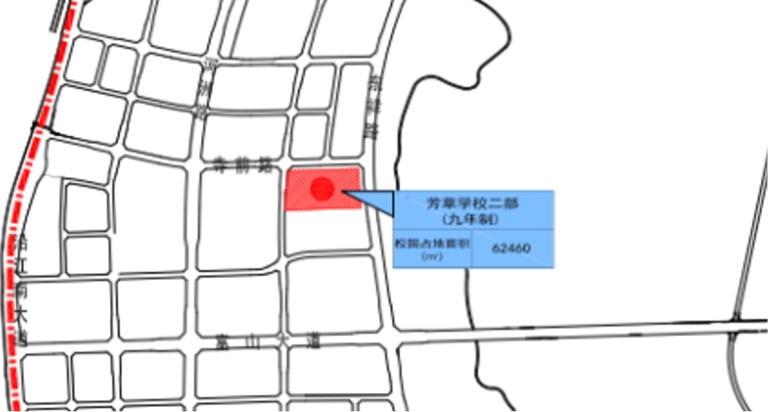 芳草路学校二部(九年制学校)位于象湖滨江南部,寺前路以南、东祥路以西,项目规划占地面积62460平方米。