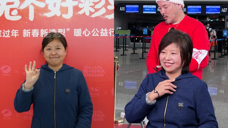 (顾霖锋老师接受记者采访) 从头聚美,向家出发 当公益插上“美丽”的翅膀,这场公益注定是一股从头到心的暖流。本次活动一共为数百位回家过年的“家人们”剪发美发,正如快乐全球公司负责人孙振坤先生所说,“明星发型师不只是服务于明星,更代表他们的高超技艺;我们邀请明星发型师在春节前夕来为普罗大众做免费的公益美发,就是希望传递这样的社会正能量,为疫情三年后的第一个新年,兔个好彩头。” 准备回云南老家过年的“母女姐妹花”就切实感受到这份温暖,正在候机厅候机的女儿刷视频看到这场直播活动,一看坐标原来就在机场,两人连忙赶过来。女儿还说“想不到竟然能让明星御用造型师为我和妈妈做头发,新年一定好运!”美发完成还拉着顾老师一起合影。