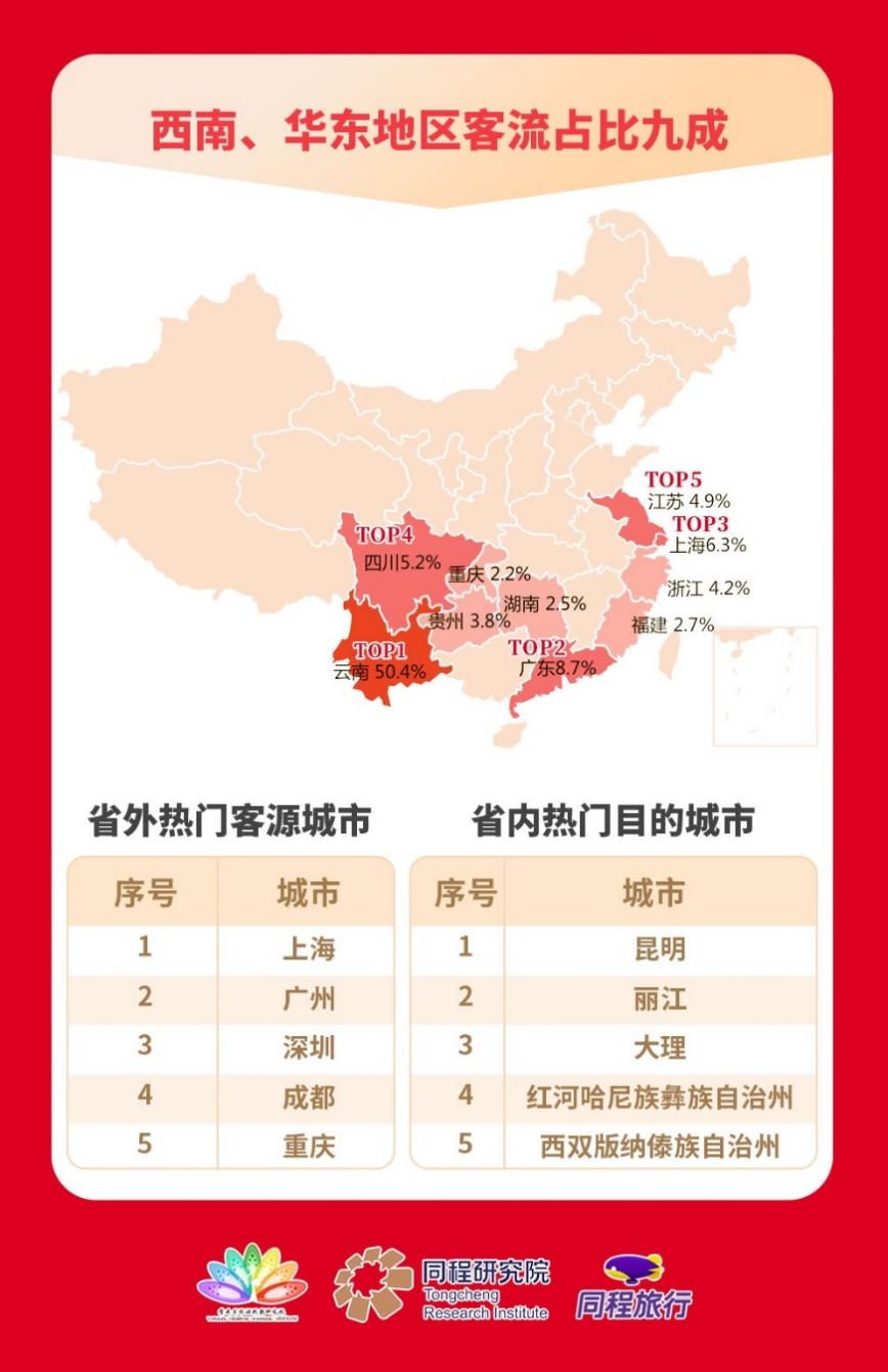 2月10日,同程研究院与云南旅游规划研究院联合发布了《云南地区2023春节旅游市场分析报告》(下称《报告》)。报告显示,2023年春节云南旅游市场表现亮眼,旅游收入规模和复苏力度均位居全国前列。云南官方发布数据显示,春节假期期间云南省共接待游客4514.61万人次,同比增长244.7%,实现旅游收入384.35亿元,同比增长249.4%,分别恢复至2019年的130.3%和132.5%。 来自同程旅行平台的数据显示,今年春节期间,云南地区线上预订渠道的客流量同比增长了123%,整体预订量恢复至2019年同期的186%。春节假期期间国内跨省游复苏势头强劲,云南跟团游线路服务人次同比增长715%。春节期间,云南地区在客流量大增的同时,整体的旅游消费势能也在加速释放,以客均851元(旅游收入与旅游人次的比,下同)的消费水平在西南地区处于领先地位。具体旅游产品方面,旅游线路的客均消费为1926元,住宿服务的客均消费为515元,交通出行的客均消费为661元。 同程旅行数据显示,春节假期期间,云南跨省游恢复势头良好,外省游客占比接近50%。外省游客主要来自广东、四川、上海、江苏、浙江等地,上海、广州、深圳、成都、重庆是最主要的外省客源地。昆明、丽江、大理、红河、西双版纳是云南地区五个热度较高的目的地。