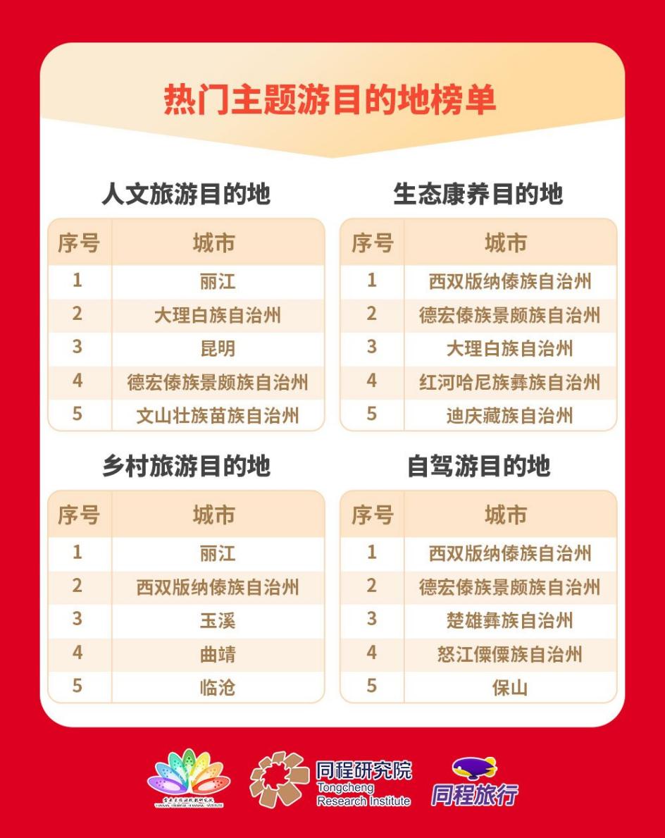 春节期间,云南各地市州旅游市场各有千秋,人文旅游、生态康养、乡村旅游、自驾游等都是较为热门的假日旅游消费主题。《报告》基于同程旅行平台的预订数据对各个消费主题的热点目的地热度排名,其中,丽江、大理、昆明、德宏、文山位居云南省人文旅游热门目的地前五名,西双版纳、德宏、大理、红河、迪庆位居云南省热门生态康养目的地前五名,丽江、西双版纳、玉溪、曲靖、临沧位居云南乡村旅游热门目的地前五名,西双版纳、德宏、楚雄、怒江、保山位居云南自驾游目的地前五名。