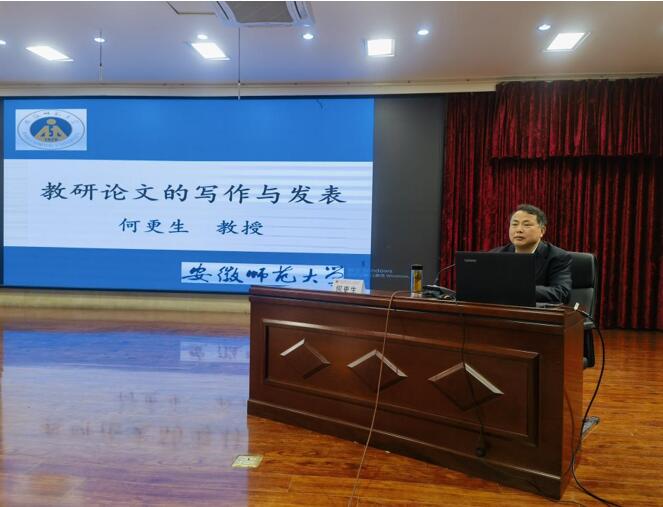 8日上午,安徽师范大学文学院教授何更生作了主题为《教研论文选题与设计的策略与实践》的专题讲座。何教授重点阐述了教研论文要写什么样的文?写什么样的题?用什么写?通常好标题都有新颖、准确、集中、独特的特点,功夫不负有心人,选定一个好题目既要下功夫,也要处处留心,要多看,多思,多磨,多问。