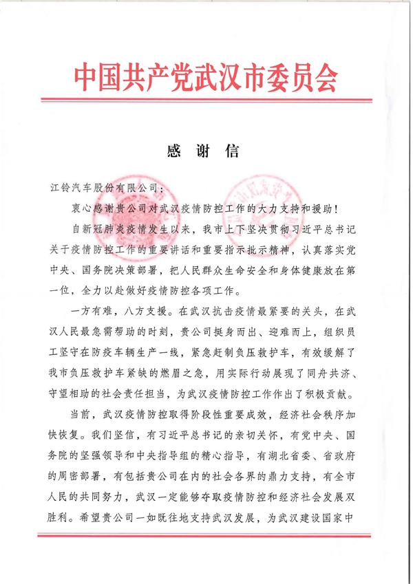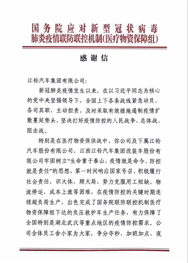 “战疫第一车”,哪里有需求就在哪里 “能力越大,责任越大”,这句话已经深深烙印在江铃福特的根骨和血脉中。作为国内最大的救护车供应商,江铃福特一直以来的使命就是产业报国,打造一流的救护车产品,温暖守护一方百姓的身体健康。 近几年的疫情防控“清零行动”中,一辆辆江铃福特救护车勇担重任,冲锋在前,与疫情赛跑,为生命护航,最大限度地避免病毒在病患转运过程中扩散,为国家卫生防疫事业贡献江铃力量。江铃福特救护车也被主流媒体誉为“战疫第一车”,多次获得国务院、中央防疫组,武汉政府、工信委等多方表彰和实名感谢信。