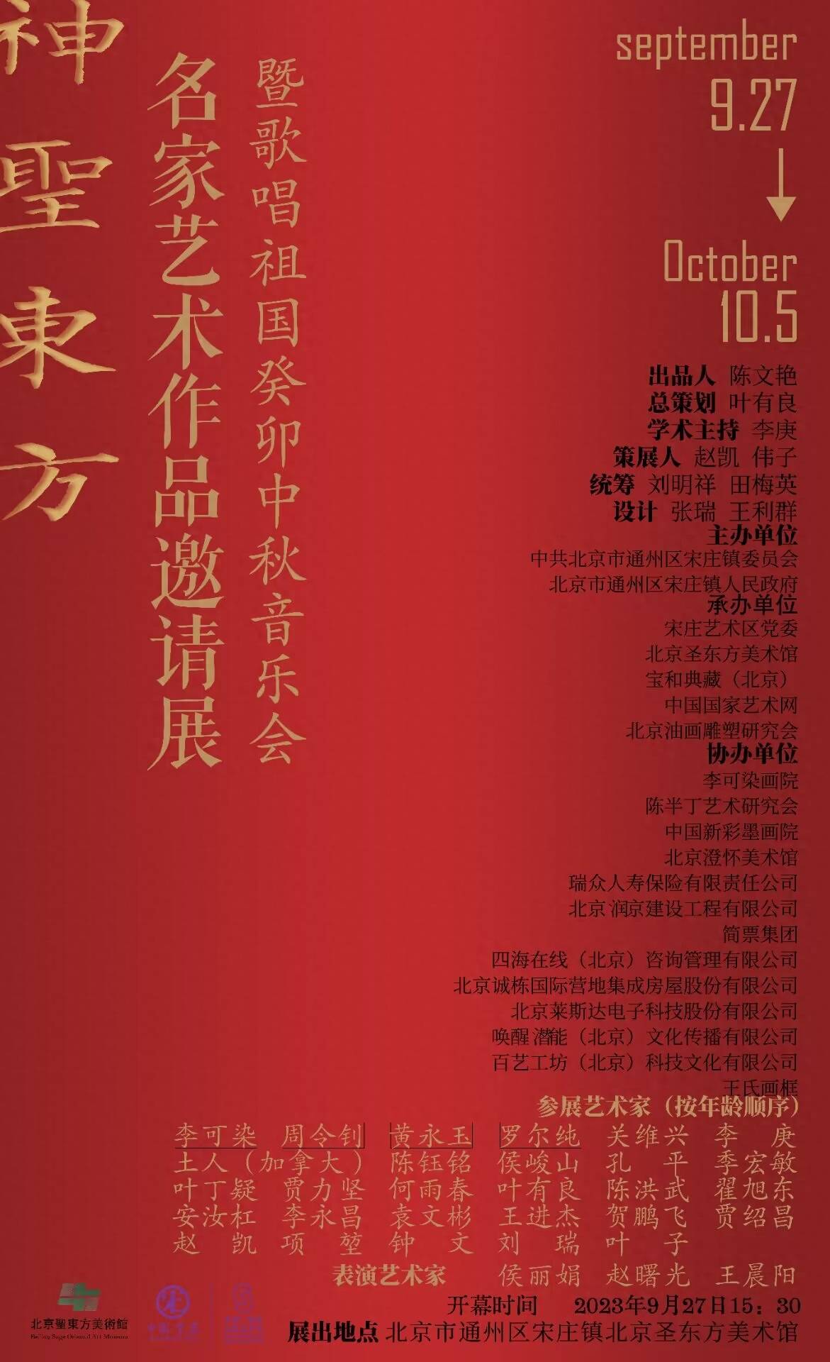 为弘扬中国传统文化,丰富首都文化艺术生活,助力北京城市副中心文化建设,迎接2023第13届中国·宋庄文化艺术节,由中共北京市通州区宋庄镇委员会、北京市通州区宋庄镇人民政府主办,宋庄艺术区党委、北京圣东方美术馆、宝和典藏(北京)、中国国家艺术网、北京油画雕塑研究会承办的“神圣东方——名家艺术邀请展暨歌唱祖国癸卯中秋音乐会”将于2023年9月27日下午3:30在圣东方美术馆举行。 本次展出28位艺术家的作品50余件(套),涵盖国画、油画、版画、雕塑、书法,皆为成绩斐然的名家精品力作。既有在全国大展中屡获金银铜等大奖的艺术家,也有在当代艺术界享有盛名的优秀艺术家。展览旨在讴歌新时代发展历程和取得的巨大成就,为实现中华民族伟大复兴贡献艺术力量。 出品人 陈文艳 总策划 叶有良 学术主持 李庚 策展人 赵凯 伟子 统筹 刘明祥 田梅英 设计 张瑞 王利群 主办单位 中共北京市通州区宋庄镇委员会 北京市通州区宋庄镇人民政府 承办单位 宋庄艺术区党委 北京圣东方美术馆 宝和典藏(北京) 中国国家艺术网 北京油画雕塑研究会 协办单位 李可染画院 陈半丁艺术研究会 中国新彩墨画院 北京澄怀美术馆 瑞众人寿保险有限责任公司 北京润京建设工程有限公司 简票集团 四海在线(北京)咨询管理有限公司 北京诚栋国际营地集成房屋股份有限公司 北京莱斯达电子科技股份有限公司 唤醒潜能(北京)文化传播有限公司 百艺工坊(北京)科技文化有限公司 王氏画框 展览周期 2023年9月27日至10月5日 开幕时间 2023年9月27日下午3:30 展出地点 北京市通州区宋庄镇北京圣东方美术馆 参展艺术家(按年龄排序) 李可染 周令钊 黄永玉 罗尔纯 关维兴 李 庚 土人(加拿大) 陈钰铭 侯峻山 孔平 季宏敏 叶丁疑 贾力坚 何雨春 叶有良 陈洪武 翟旭东 安汝杠 李永昌 袁文彬 王进杰 贺鹏飞 贾绍昌 赵凯 项堃 钟文 刘瑞 叶子 表演艺术家 侯丽娟 赵曙光 王晨阳 部分展出作品欣赏