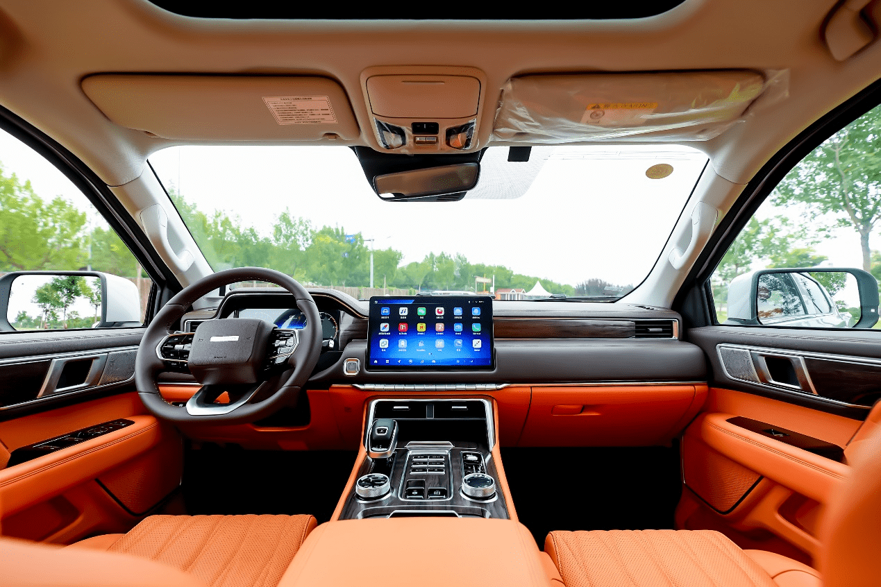 内饰方面,内部采用大面积皮质包覆,带来豪华的视觉感受;同时拥有沉稳黑、激情橙、儒雅蓝三款内饰颜色可供客户选择;10向电动调节座椅,超大全景天窗,提升驾乘舒适性的同时,带来更加开阔的视野。