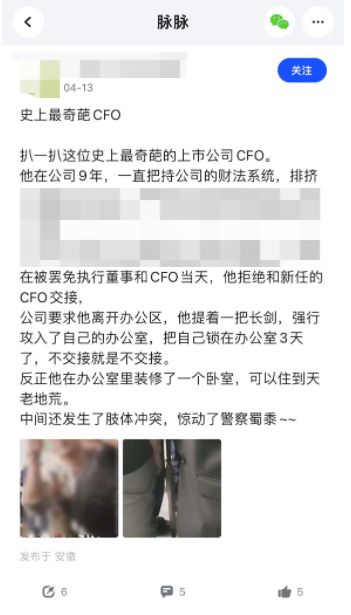 脉脉用户爆料称,宝宝树CFO被免职后拒绝交接,手持长剑强行闯入办公室 图片来自脉脉平台 随后,“高管被曝免职后持长剑闯办公室”的话题登上微博热搜,网友戏称这是“武侠式商战”。 就在爆料贴发出的前两天,宝宝树曾发布公告称,CFO徐翀被免职,同时任命了新的CFO。宝宝树在公告中提及:公司对徐翀的表现并不满意,免职符合公司和股东整体的最佳利益。 这则免职公告很快掀开了宝宝树“高层内斗”的序幕,据南方都市报报道,今年3月,疑为徐翀在公司群内发布过的一篇“反思长文”在社交平台流传。文章称,自2018年后,宝宝树步入“复星集团委派管理时代”,在复星高层及委派人士的管理下,宝宝树出现一些经营问题。 复星集团在2016年参与了宝宝树D轮融资,此后多次增持,在2019年10月取代宝宝树创始人王怀南,成为公司第一大股东,宝宝树也成了“复星系”旗下公司。 而宝宝树新任CFO高晓光有着“复星系”背景,公告披露,高晓光近几家任职的公司都在复星集团旗下,如舍得酒业(600702.SH)、豫园股份(600655.SH)等。红星资本局发现,除了高晓光,“复星系”高管汤亦敏也接替了宝宝树联席公司秘书马烈的职位。 4月20日晚间,宝宝树集团发布公司声明称,近期留意到某些人员通过网络发表不负责任的言辞。对该类歪曲事实的言论,公司保持追究其法律责任的权利。 “武侠式商战”风波也波及到了宝宝树大股东复星集团。 据南方都市报报道,徐翀被免职后实名向媒体举报了公司的上市造假过程,称宝宝树以及复星旗下多家上市公司,利用“结构单”手段扩大IPO发行规模,涉嫌构成虚假上市。其称有充分确凿证据,希望引起香港证监会、联交所等机构关注。