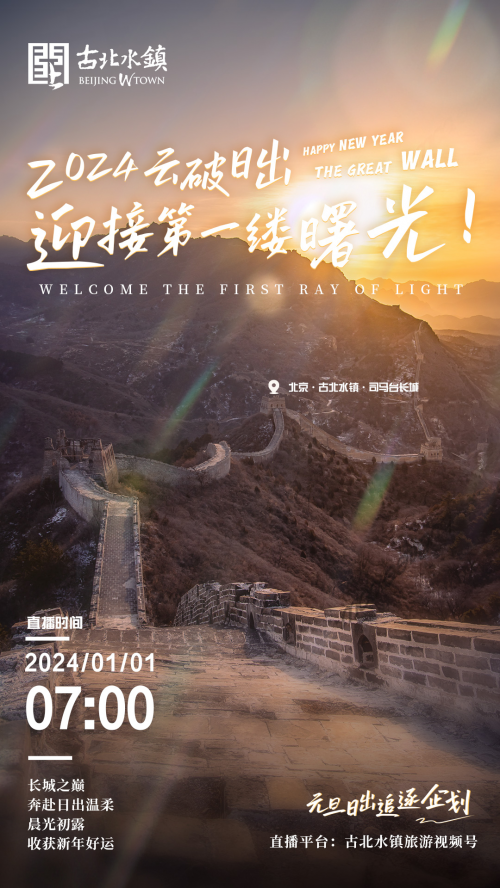 03.遇见新年日出——收获2024整年好运 日出雾露馀,青松如膏沐。黎明将所有的高脚杯都斟满了酒,太阳向天下昭告它的存在。在阳光普照的光辉下,所有的敏感、不安都被驱散了,我们勇敢而热烈奔赴新的赛场,2024年1月1日7:00,关注“古北水镇旅游”视频号,直播新年的第一场日出,收获好运,抬头见喜!