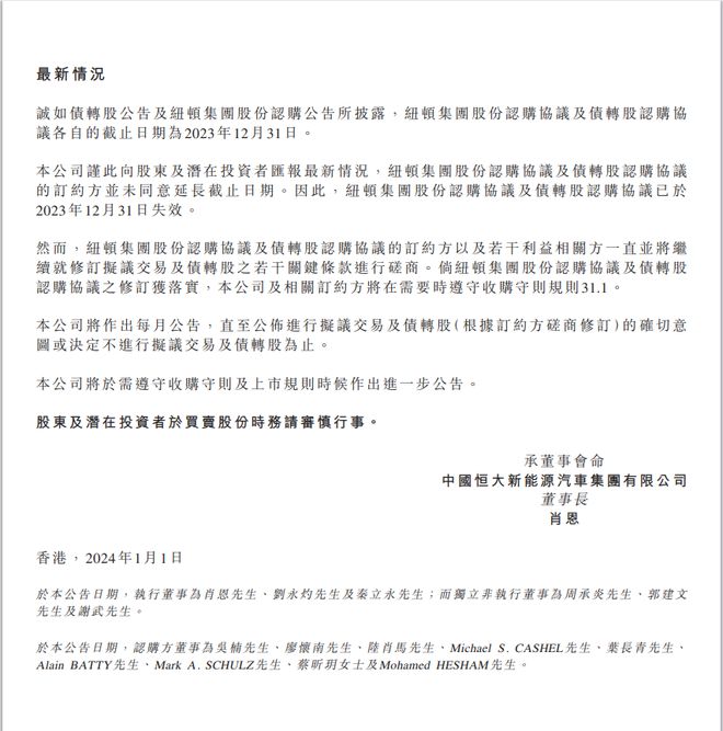 恒大汽车(HK00708;股价0.510港元;总市值55.30亿港元)2024年1月1日晚间在港交所公告,纽顿集团股份认购协议及债转股认购协议已于2023年12月31日失效。