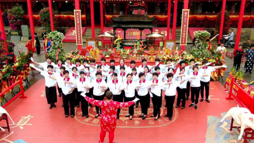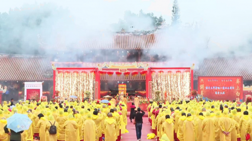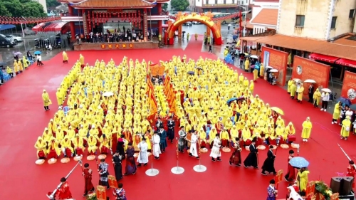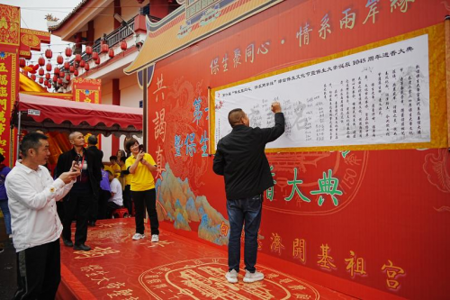 ——以台南学甲为首的两百多位台湾宫庙代表和众漳州宫庙代表共四百余人雨中共祭,感动天地 2024年4月7日,第六届“保生聚同心,情系两岸缘”漳台保生文化节开幕式暨保生大帝圣诞1045周年进香大典在福建漳州白礁慈济开基祖宫隆重举行。逾两百位台湾宫庙代表热情参与,大陆各地与会嘉宾共四百余人。台南学甲慈济宫董事长王文宗在此次进香大典上也是主祭人之一。早在八时嘉宾就已经陆续莅临会场,而场外早已聚集人山人海的民众翘首盼望这一精彩庆典开幕。 从保生路穿越层层黄金拱门,便来到签到墙,古风的卷轴配上龙年纹样古意十足。大家纷纷在卷轴上签上自己的名字,与卷轴合影留念。向左进入主会场,热情洋溢的白礁姑娘们笑容灿烂,鼓乐阵阵,迎接越海翻山前来的宫庙朋友们。