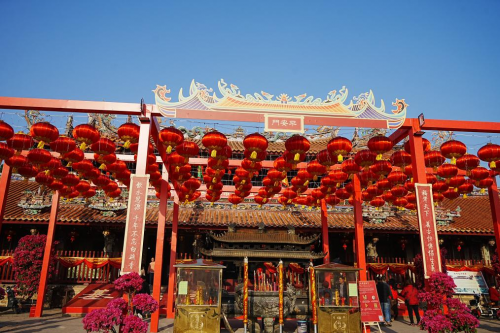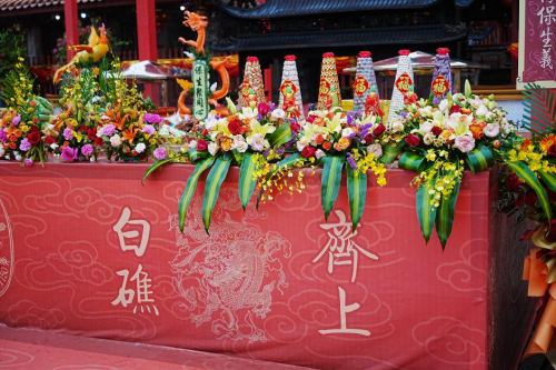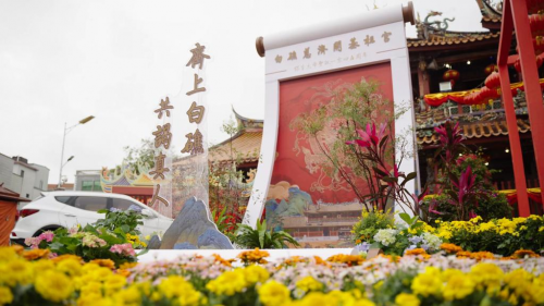 太平门的左右两侧是虔诚信众答谢的1045盆鲜花在雨中劳作多日呈现的优美花坛造型,堪称艺术品,寓意保生大帝福泽天下,圣诞1045周年所有人幸福、美满。