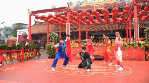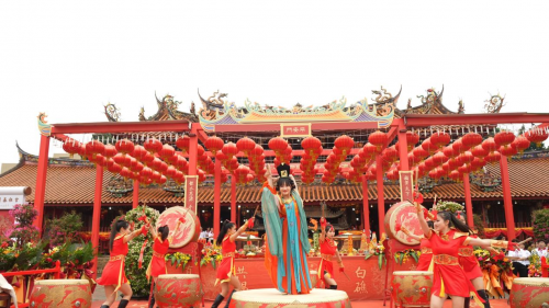 主广场两侧,除了为服务群众提供的志愿者服务中心和慈济中医义诊区,还有六块精心布置的文化墙,深入浅出的讲述了慈济祖宫的辉煌历史、保生大帝的历代册封,也为嘉宾观众们指路分享了这座被称为“闽南故宫”的第一批国家级文保单位中精美绝伦的艺术作品诸如石雕、竹叶诗、壁画等等。与白礁慈济祖宫共同坐落在九龙江入海口的“林氏义庄”、“曾氏番仔楼”、“江东桥”、“天一信局”也一起见证了闽南人在这块土地上的沧海桑田,是智慧、艺术、信仰和财富的结晶,见证了闽南人过台湾下南洋打拼的血泪心酸和建树。如今这些闽南人的后代有些已成为海外同胞和侨胞,大家无论身居何处,都会想念故土,回大陆寻根,这是剪不断的中华脉络,血浓于水的中华深情。 值得一提的是广场左侧的其中一个文化墙,讲述了学甲慈济宫上白礁的历史渊源,摄影《郑王军民登陆与上白礁谒祖纪念碑》十分震撼。“上白礁的重要环节之一,是信众们来到将军河畔与台湾海峡的交接出口处,举行隆重的“遥望祖庙”与“寻根祭典”活动,向白礁的保生大帝谒祖参拜。全体信众跪下行最大敬礼。三献礼的最后,会手捧着从台湾海峡流入将军溪的海水,带回家中。一是供奉家中神明保生大帝,二是遍洒在各家祖坟之上,“吃果子,拜树头”寓意“饮水思源”,“慎终追远”。”着实令人动容。 浏览过所有的文化墙,也到了文化节开幕的时间。十点钟准时开始,传统的鼓舞将文化节拉开帷幕。舞者伴随周边战鼓声阵阵,在鼓面翩翩起舞,刚柔并济赢得场下的无数摄影与掌声。需要团结与勇气的舞狮与舞龙表达了人民祥瑞丰收与合境繁荣昌盛的愿景,武术冠军队带来的武术和旗舞表演则展现了新时代承接传统文化的少年们的坚韧信念和勃发英气,将气氛推向高潮。白礁村的大鼓凉伞队的大姐姐们,今年为保生大帝准备了新的节目:她们多才多艺,放下鼓槌和凉伞戴上白手套,在潇洒的指挥下一展嘹亮歌喉,《来去白礁拜真人》真实的描绘了人们自发聚集起来,翻山越海来到白礁村“上白礁”的欢乐与期待。至此雨水渐渐变大,现场竟然还是井然有序,四百余位宾客在分香姑娘们的有秩序协作下把雨衣派发到每个人的手中,大家依然冒雨期待迎拜神明。最后一个节目《九州龙吟》,舞者们果然不负台下所有人们的期待,在雨中越发笑容灿烂,这个与传统健身项目“甩龙”相结合的舞蹈,真切的表达了保生大帝用中草药和药签文化悬壶济世的神医精神和要人们强身健体的心愿。舞者们编排真是巧妙用心!