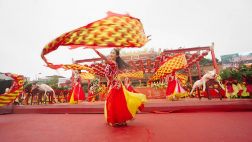 主会场上的装点充满传统民俗节日气氛,以闽南飞檐的插画和温暖的红灯笼做门顶,以“福泽天下,万古恒传保生义;饮水思源,千年不忘白礁香”的对联做门柱,以花瓶造型漳州市花三角梅花瓶做门当,它们共同组成了太平门。祖宫别出心裁的设计,寓意为大家祈福“甲辰太平,阖家安康”。