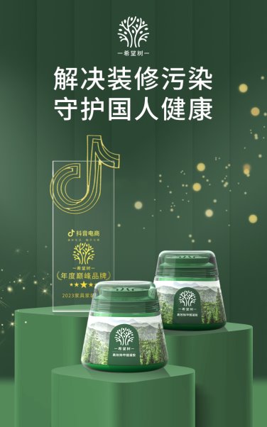 在2023年,希望树不仅保持了其在甲醛清除剂类目的领先地位,更在天猫平台上拿下了室内芳香用品和甲醛清除剂类目的双料冠军,预计品牌的全年销售额超10亿。此次荣获“2023抖音电商家具家装行业年度巅峰品牌”,是对希望树在家居家装行业中创新能力和市场表现的充分认可。 展望未来,希望树将继续携手抖音平台,依托抖音电商平台的强大资源,专注更精细、更精准的营销策略,进一步扩大市场份额,加强品牌建设。同时,希望树也将继续秉承“解决装修污染,守护国人健康”的企业使命,为消费者带来更多健康、环保的家居生活选择,让每一个家庭都能享受到绿色、安全的居住环境。 |